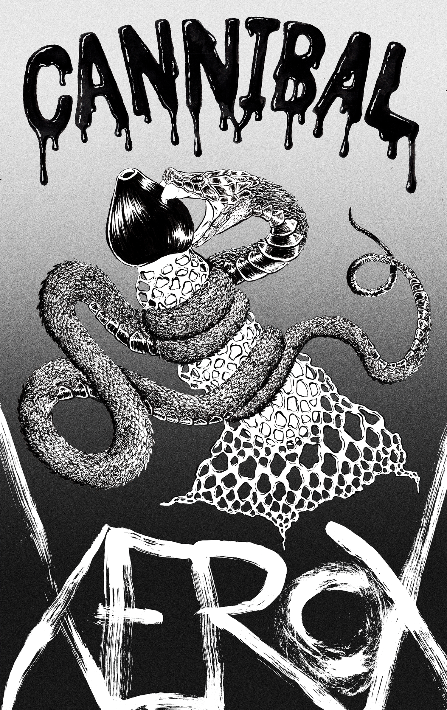 Cannibal Xerox is an anthology of horror artwork focussing on the theme of sexuality. Always printed in black and white, embracing the analogue grunge of ink splatters, off-registration, roller tracks, chunky dithering, and noise.